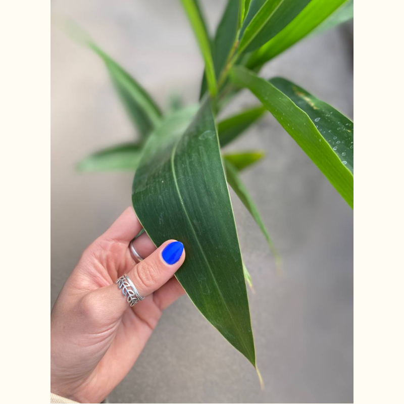 La Alpinia es una planta perenne de origen asiático que suele alcanzar una altura de entre 2 y 3 metros. Posee hojas alargadas muy llamativas de color verde brillante que pueden llegar a medir 70cm, y que caracterizan a la planta por su curiosa disposición. Crece de forma robusta y en grupos densos, creando matas de apariencia lujosa y exuberante. Por esto se suele utilizar para armar macizos y borduras en jardines y patios.