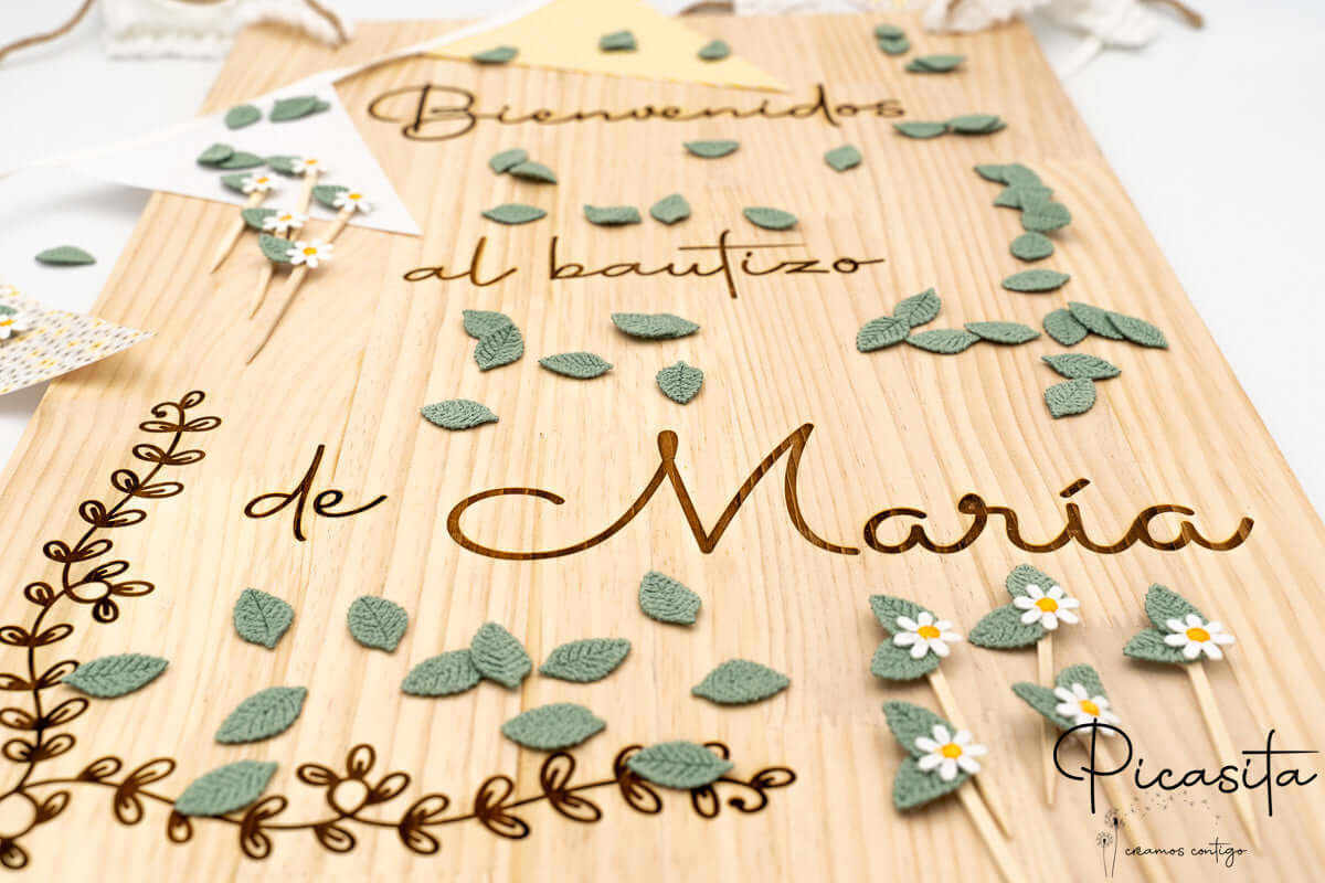 En Picasita utilizamos tecnología de láser de alta precisión para dar vida a tu diseño. Al trabajar sobre la madera natural, el resultado del grabado es un elegante tono de madera quemada con un sutil bajorrelieve al tacto. Esta técnica es infinitamente superior a otras opciones, ya que el mensaje de bienvenidos a bautizo o el diseño de bienvenidos a comunión queda integrado permanentemente en la fibra de la madera, sin riesgo de que se despegue o se borre con el tiempo. Podemos añadir florituras, ramas decorativas o dibujos temáticos para que tu cartel madera personalizado sea exactamente como lo imaginaste.