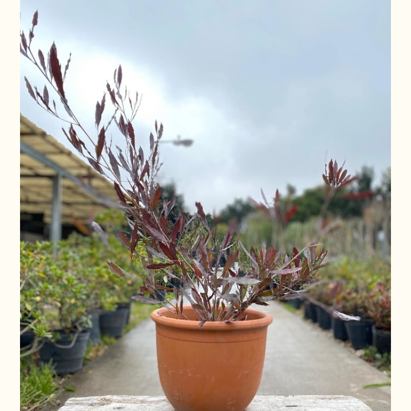 La Dodonea es un arbusto proveniente de sudáfrica, de ramas erectas y hojas perennes de color púrpura intenso en invierno, característica que lo hace muy vistoso. Sus hojas alargadas, además, están recubiertas de glándulas en ambas superficies, por lo que resulta pegajosa al tacto. También posee flores con forma de cápsula, de un color blanco cremoso.